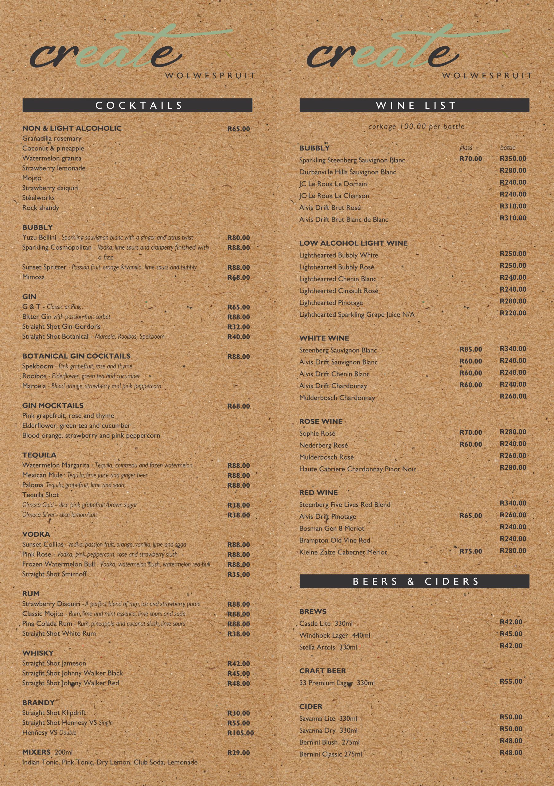 Cocktails, Beer and Wine Menu